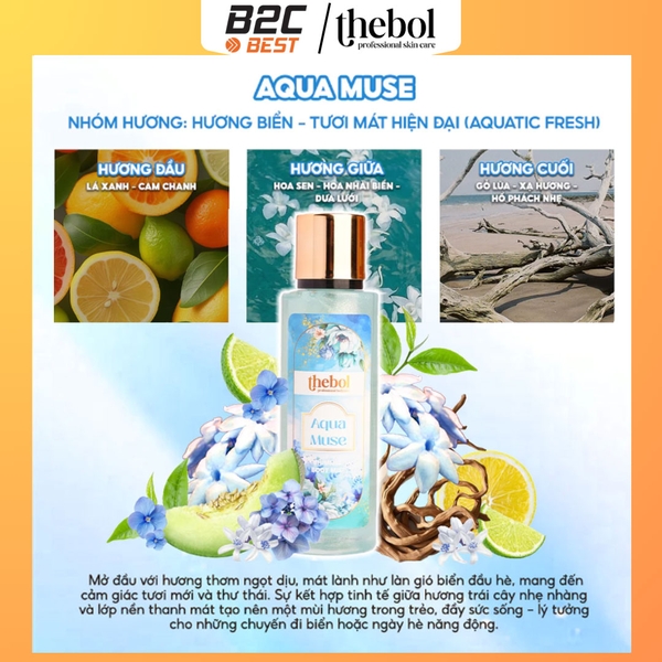 Body Mist Thebol Aqua Muse mở đầu với hương thơm ngọt dịu, mát lành như làn gió biển đầu hè. Sự kết hợp tinh tế giữa hương trái cây tươi mát và lớp nền thanh khiết tạo nên một mùi hương trong trẻo, đầy sức sống – lý tưởng cho những chuyến đi biển hoặc ngày hè năng động.