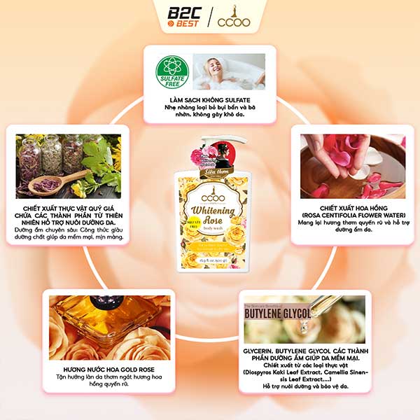 SỮA TẮM NƯỚC HOA SULFATE-FREE HOA HỒNG VÀNG CCOO là dòng sữa tắm cao cấp đến từ thương hiệu CCOO, kết hợp hương hoa hồng vàng độc đáo cùng công thức không chứa sulfate, mang đến cảm giác làm sạch dịu nhẹ, nuôi dưỡng sâu và lưu hương sang trọng sau mỗi lần sử dụng.