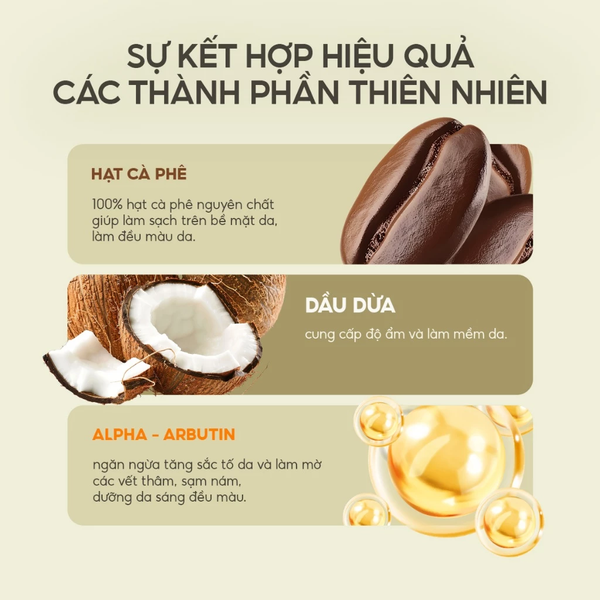 - Coffea Robusta Seed Powder (Cà phê Robusta): loại bỏ da chết cơ học, kích thích tuần hoàn máu, cho da hồng hào.