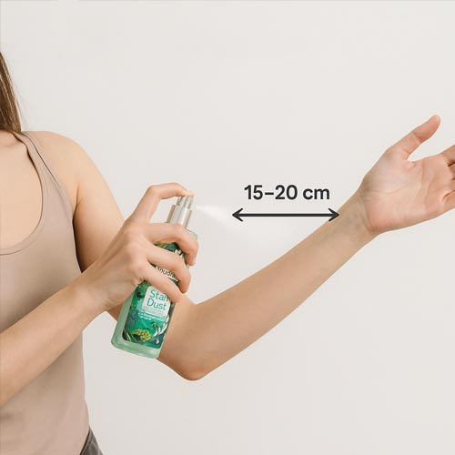 - Khoảng cách lý tưởng: Giữ chai body mist cách da khoảng 15–20 cm. Xịt nhẹ để tạo một lớp sương mỏng, giúp hương thơm phủ đều lên da.