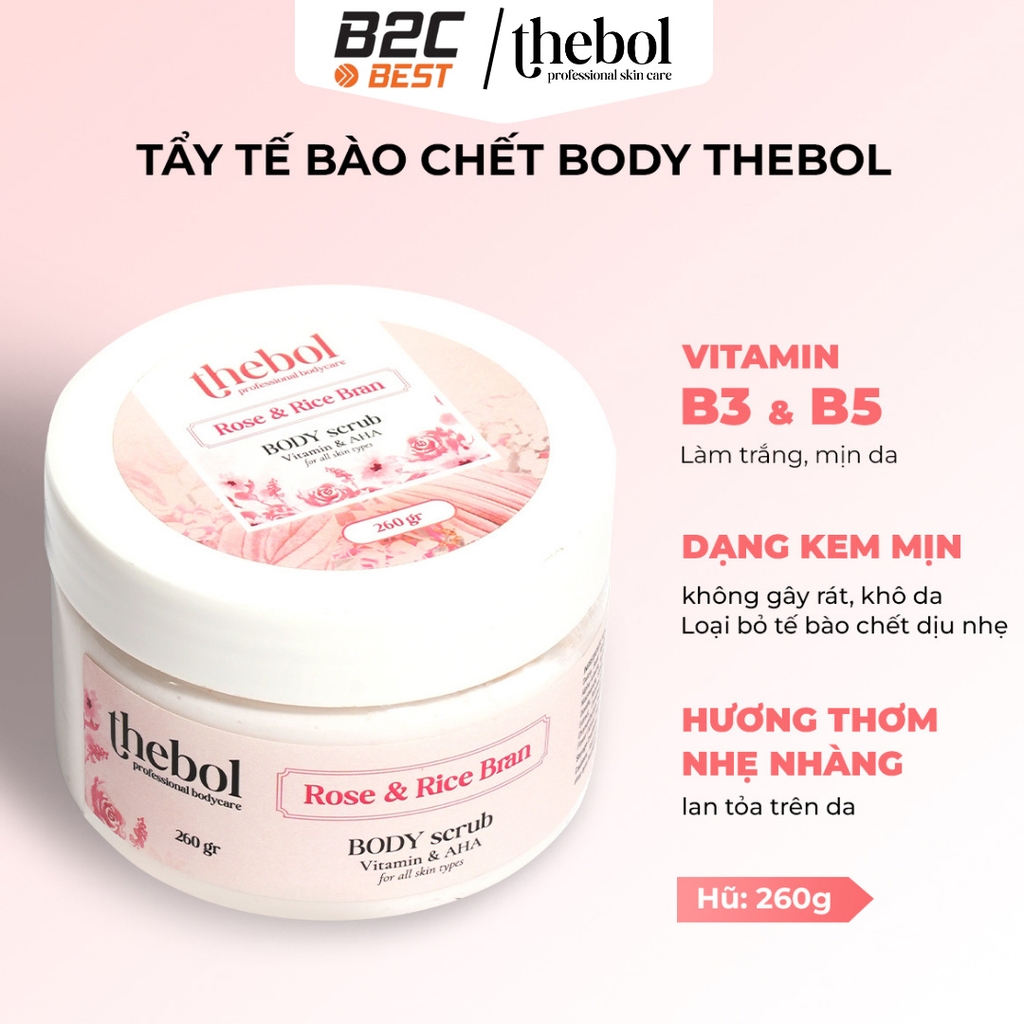 Sản phẩm tẩy tế bào chết body Thebol 260g (Thebol - Rose & Rice Bran Body Scrub) phiên bản Rose & Rice Bran được chiết xuất từ hạt scrub thiên nhiên và dược liệu lành tính, giúp loại bỏ hiệu quả lớp da chết xỉn màu, đồng thời nuôi dưỡng da sáng mịn, đều màu. Sản phẩm mang hương thơm quyến rũ, ngọt ngào và nữ tính từ hoa hồng kết hợp với cám gạo.
