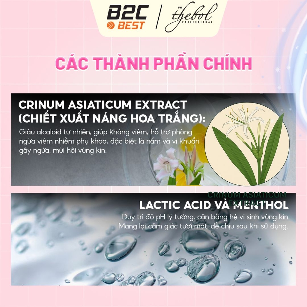 THEBOL Crinum là dòng dung dịch vệ sinh phụ nữ cao cấp, nổi bật với thành phần Crinum Asiaticum Extract – chiết xuất từ cây náng hoa trắng, kết hợp cùng nhiều loại thảo dược thiên nhiên. Sản phẩm mang đến giải pháp chăm sóc vùng kín an toàn, lành tính, giúp làm sạch – khử mùi – kháng khuẩn nhẹ nhàng mà hiệu quả.