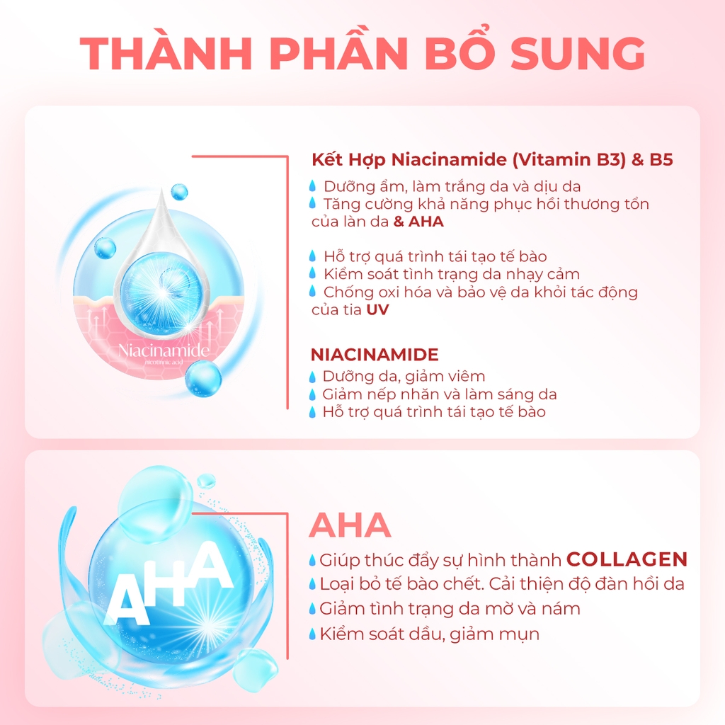 - Niacinamide: Hỗ trợ sáng da, đều màu.
